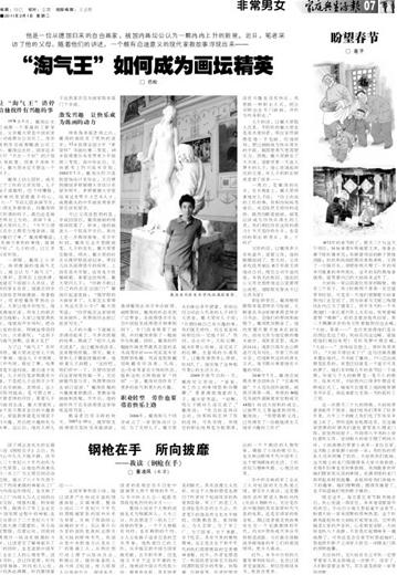 可让父母没想到的是,学成回国后,戴洵画画的情绪却低落了。原来,他的画进入一个较高平台后,再往上走一步都很艰难。有半年时间,戴洵完全不想摸画笔。儿子的变化,戴大荣看在眼里。那次,戴大荣的好友从俄罗斯旅游回来,带回几份圣彼得堡市的报纸,上面有美术专版,还有电子投稿邮箱。拿着这份报纸,戴大荣问儿子: “你敢不敢让自己的作品走出国门?”戴洵打起退堂鼓: “俄罗斯的大画家多了,人家怎么看得上我这无名小卒?”戴大荣笑道: “你若能在这家报纸发表画作,我赞助你去丽江旅游写生。”