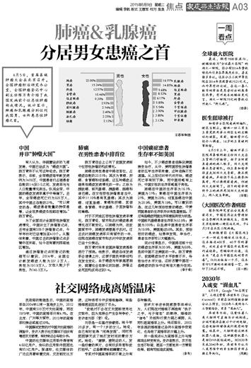 ·肺癌&乳腺癌分居男女患癌之首 | ·社交网络成离婚温床 | ·一周看点 |