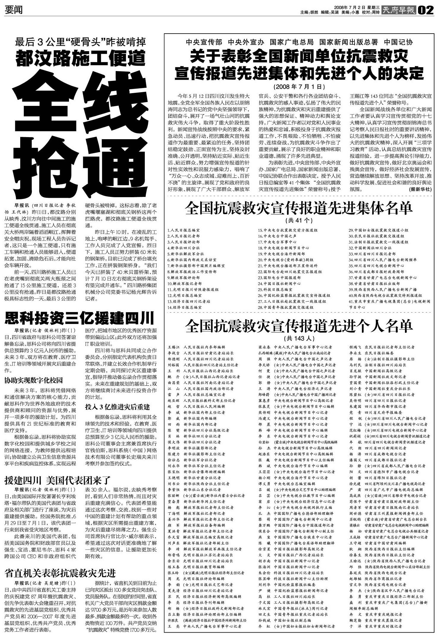 关于表彰全国新闻单位抗震救灾宣