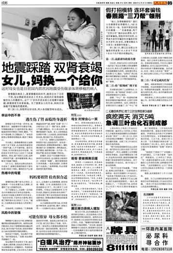 地震踩踏双肾衰竭 女儿,妈换一个给你