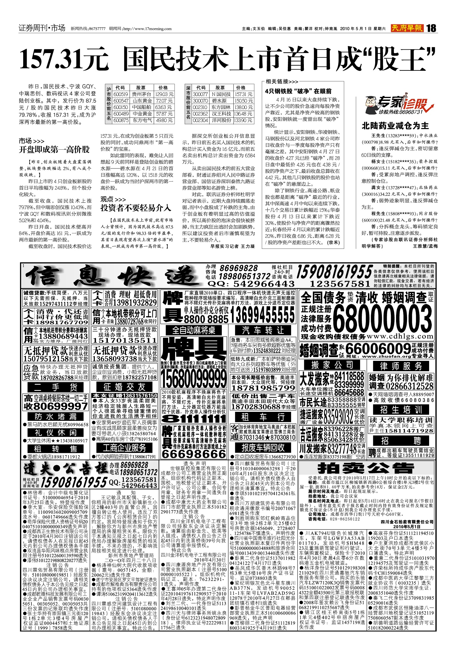 157.31元 国民技术上市首日成“股王