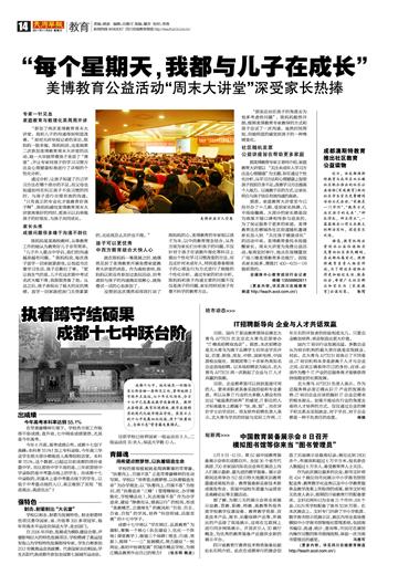 成都十七中将以“学在锦江、品质教育”为旗帜,聚集一个核心(队伍建设),优化一个阵地(课堂教学),做强三个保障(理念、行政、资源),按照“一一三”发展模式,努力建设“一校两址,高初中协调发展”的城市精品学校,为锦江精品教育作出自己的努力! (张东明赖波)