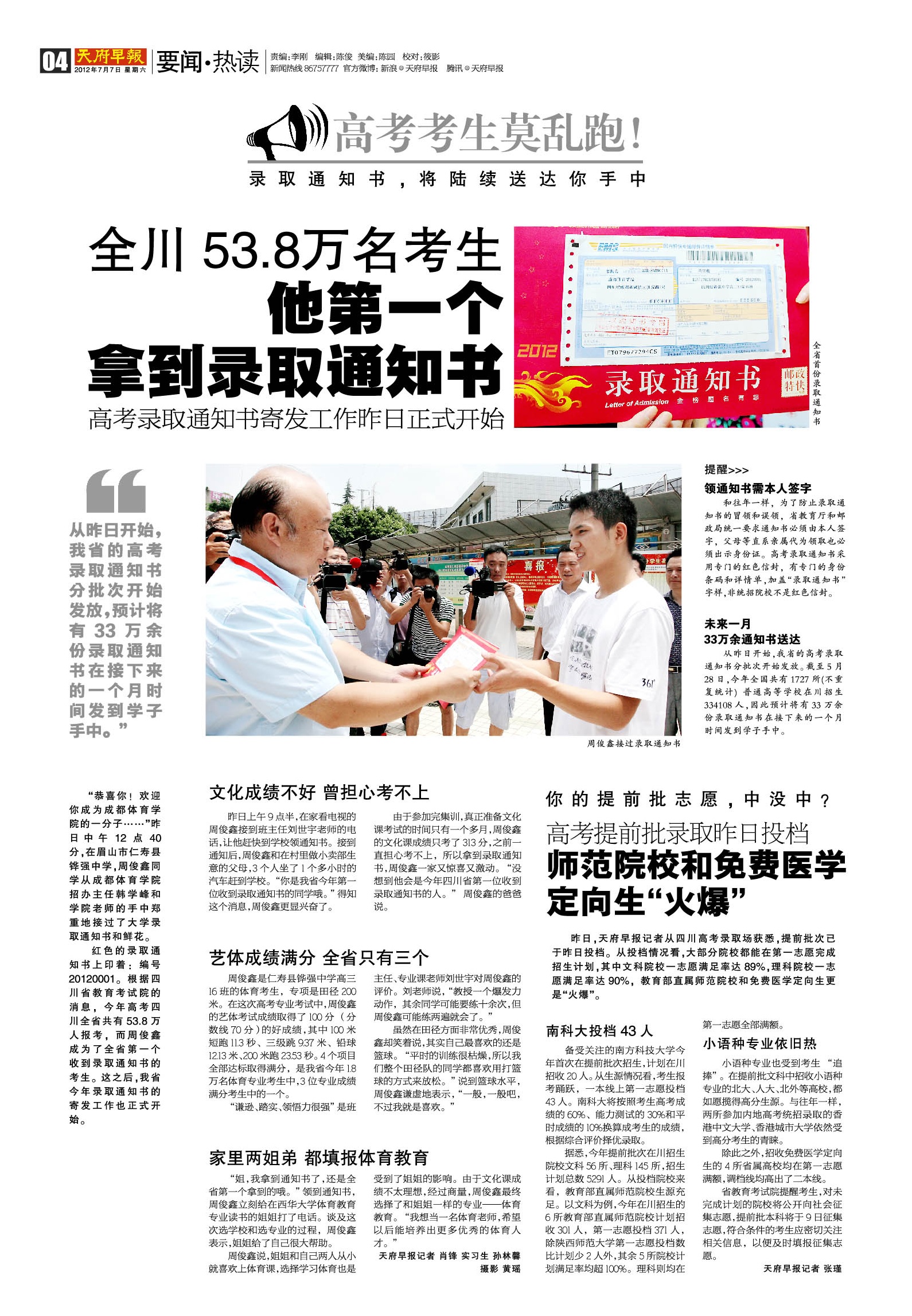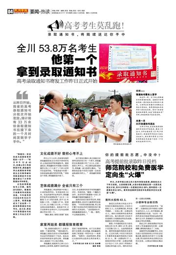 全川53.8万名考生 他第一个拿到录取通