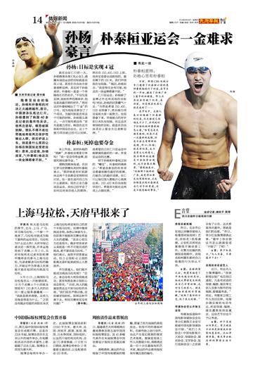 随着亚运会的临近,孙杨和朴泰桓的对决之火越燃越烈。前日,中国游泳队抵达仁川,孙杨遭到了韩国40多名记者的轰炸性采访,他两次退却,唯恐被踩到脚。领队不得不连拉带拽地将他两次保护性揪出人群,然后护送上车。到底是什么原因让孙杨在韩国如此受欢迎呢?原来,出征前,孙杨放言,“(朴泰桓)他这次一块金牌都拿不到。”