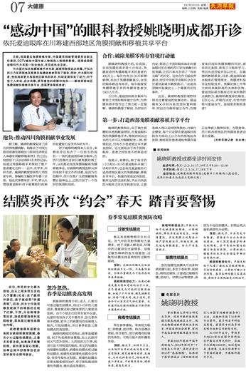 姚晓明教授同时指出,春季温暖潮湿,利于各类病原体繁殖,加上这段时间天气忽冷忽热,人的抵抗力下降,极易引发不同程度的眼疾。常见的结膜炎有细菌性结膜炎、病毒性结膜炎和过敏性结膜炎,细菌性和病毒性结膜炎会传染,有些传染性还很强。病毒性结膜炎如果未接受规范治疗,有可能发展成病毒性角膜炎,继而造成角膜盲。