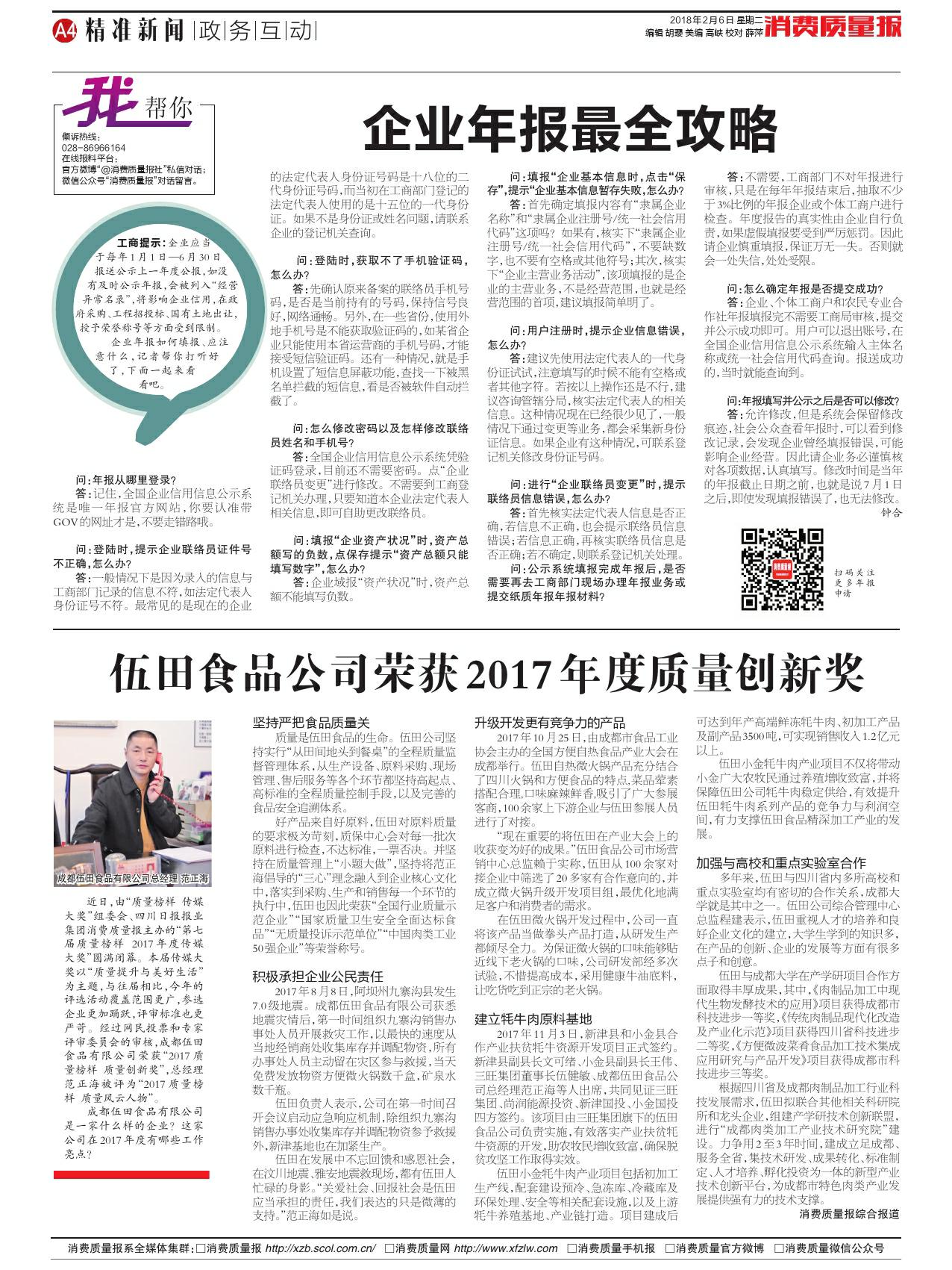 伍田食品公司荣获 2017 年度质量创新