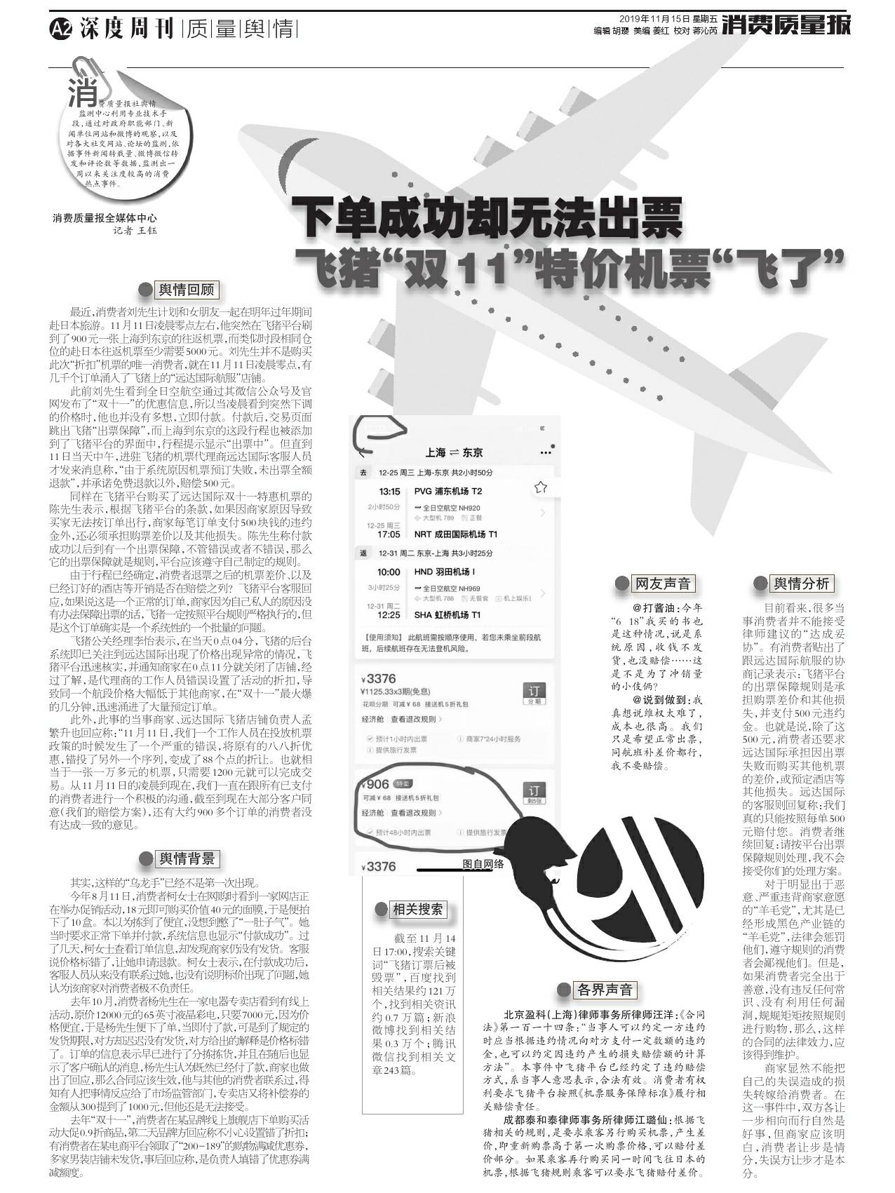 下单成功却无法出票 飞猪“双 11”特价